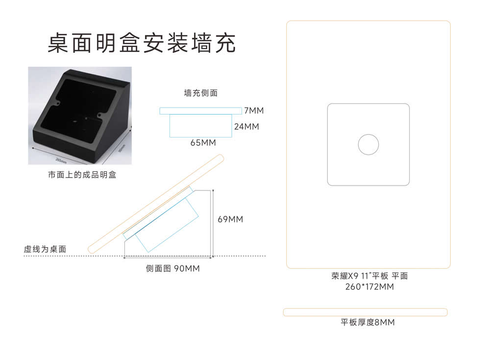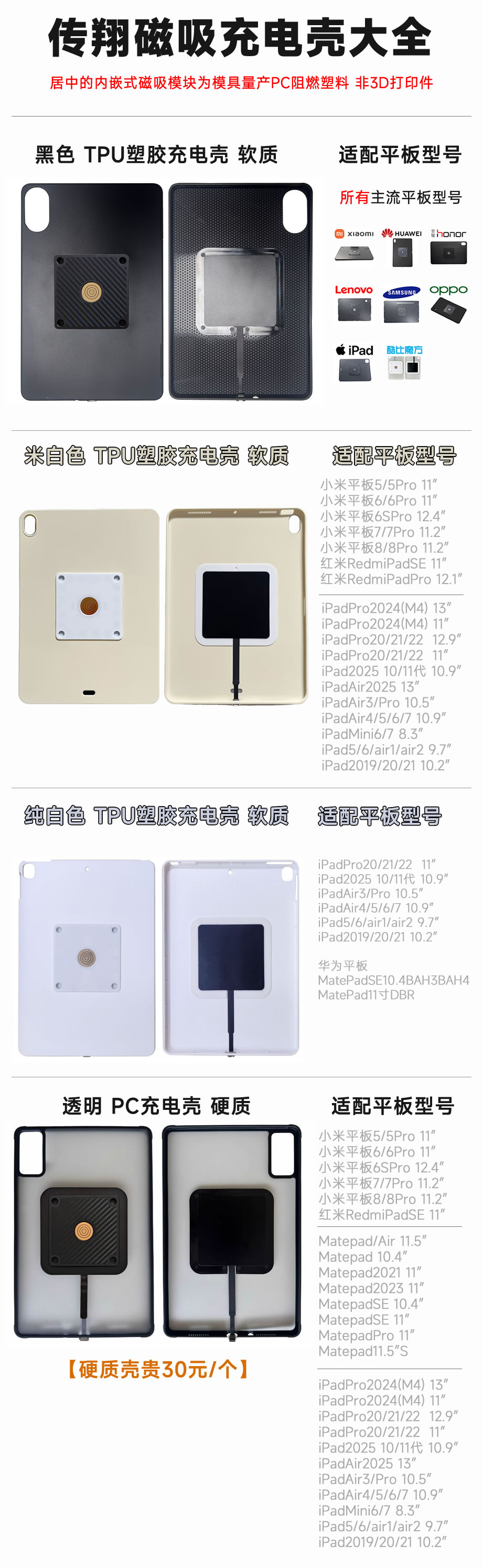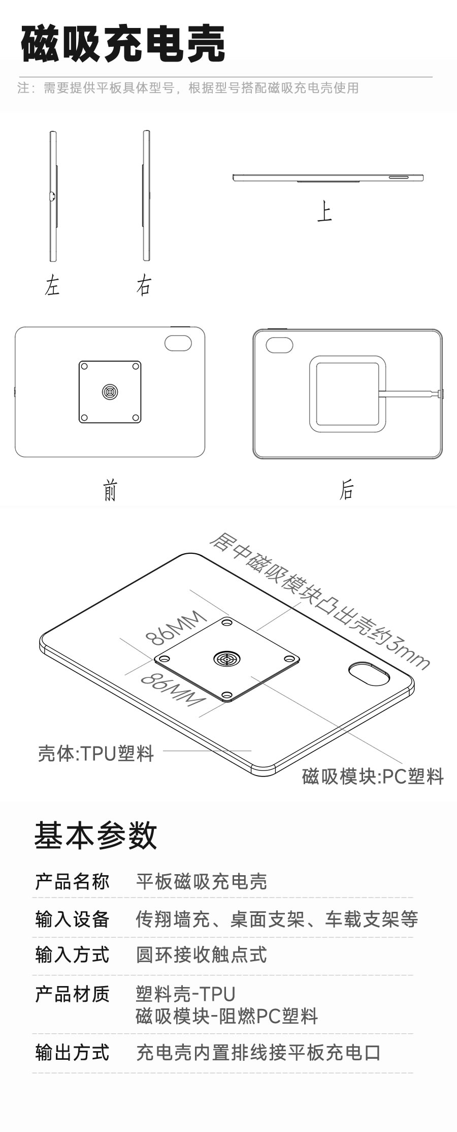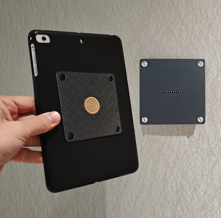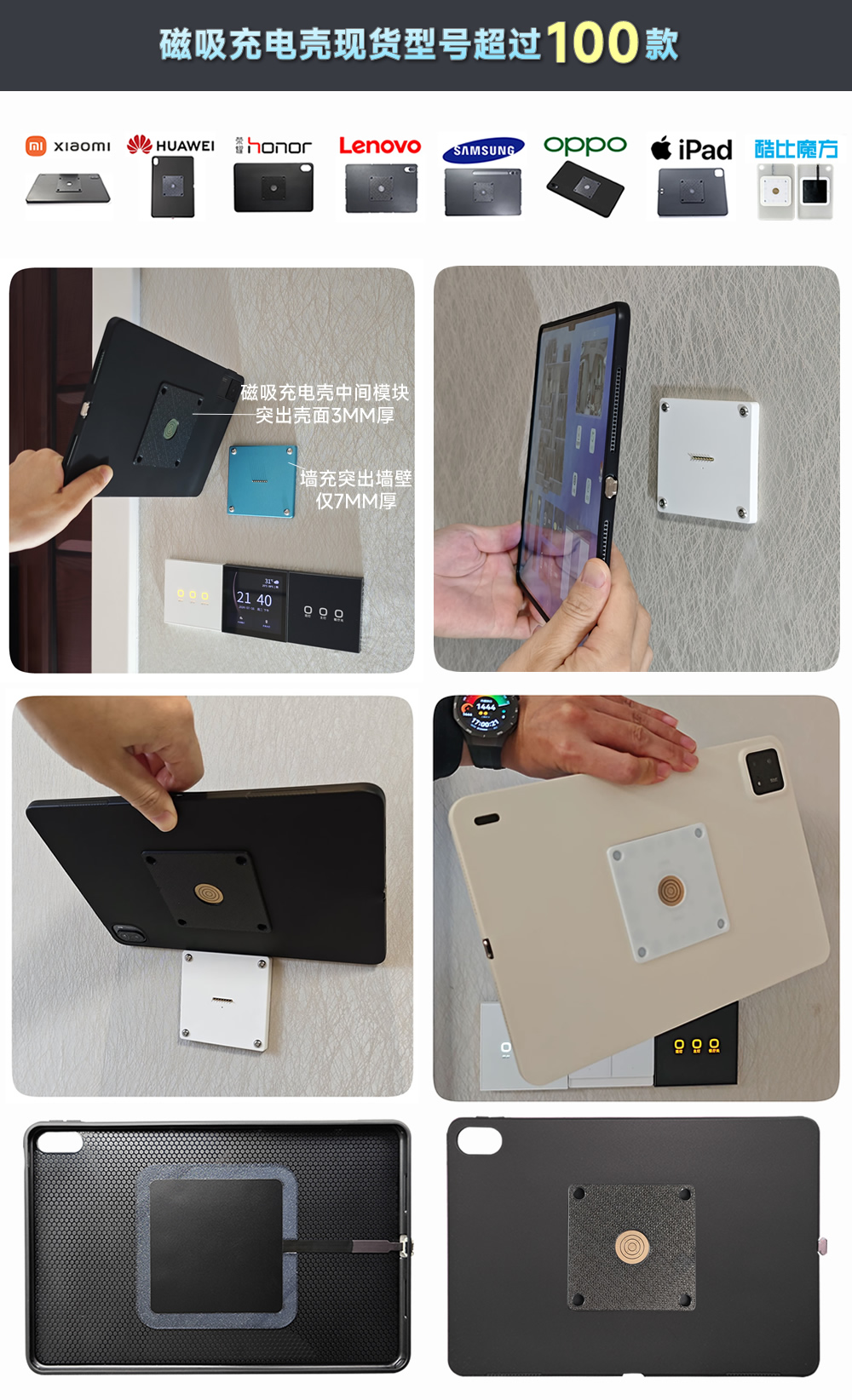 使用传翔标准墙充,通过安装桌面明盒实现平板磁吸充电,通用性高,安装操作简单。但会占用桌面空间。