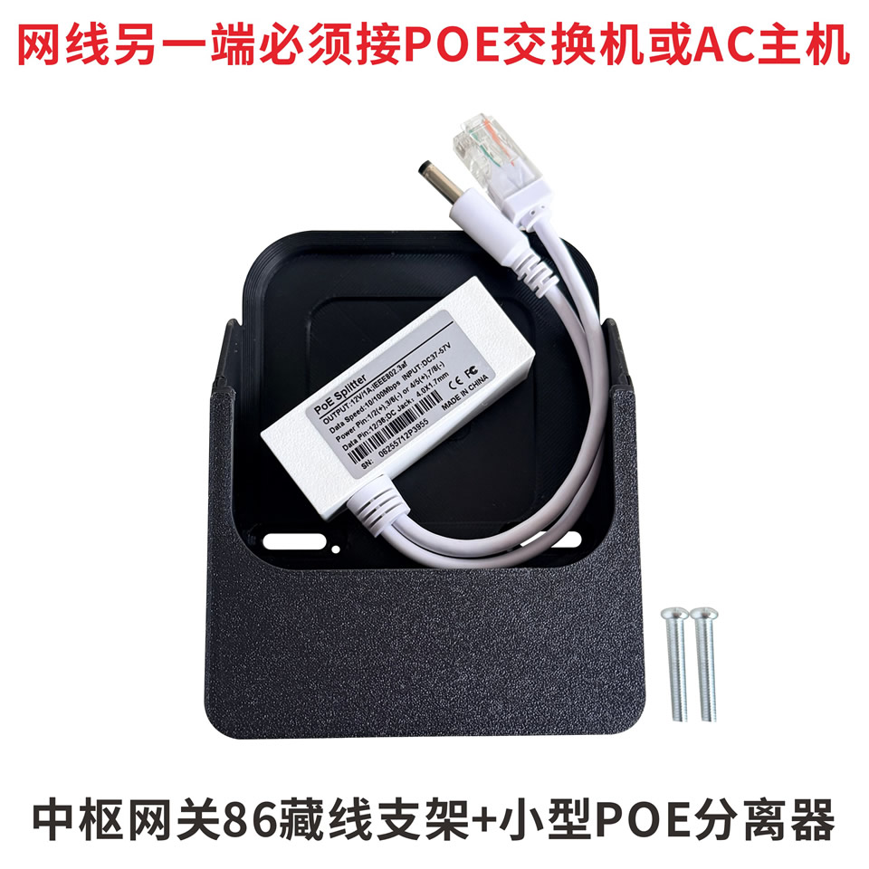 阻燃材料,86底盒安装,暗装POE分离器,可将从POE交换机或路由器接入的网线分离成网口和中枢网关的电源口